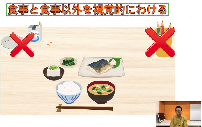 - 食事の場面:ランチョンマットを敷き、食器に入っているものだけが「食べるもの」。