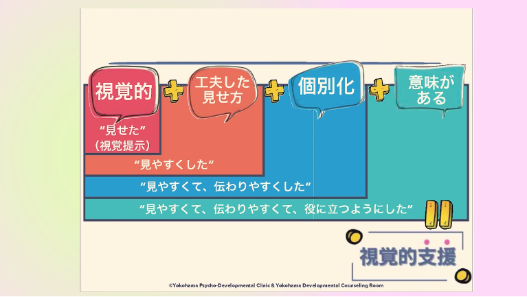 「視覚的提示(ただ見せるだけ)」から「視覚的支援(本人が理解し、納得して動ける)」へ。