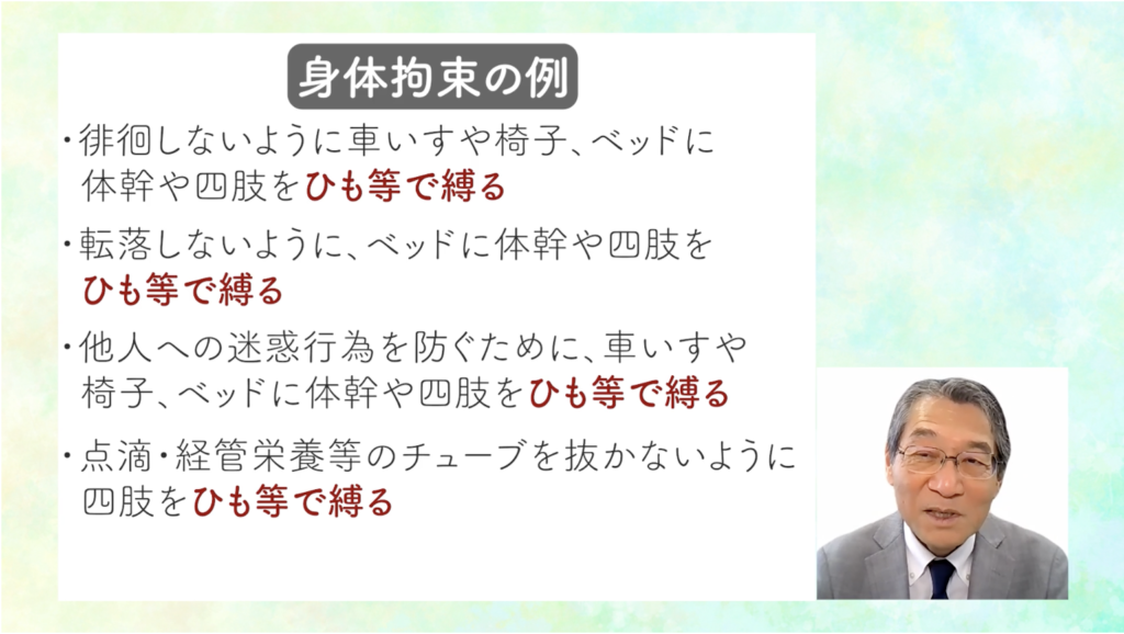 「安全のため」という理由は、拘束を正当化する理由(切迫性・非代替性・一時性の3要件)を検討する材料にはなりますが、拘束であるという事実に変わりはありません。