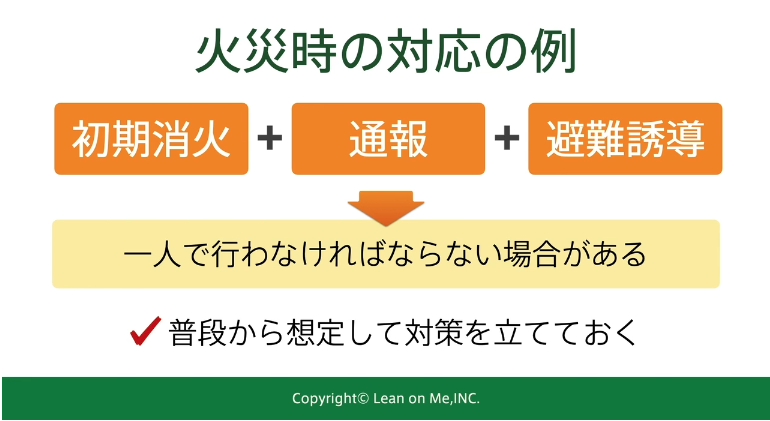 もし火災が起きた時、たった一人の職員が以下のことを「同時並行」で行わなければなりません。