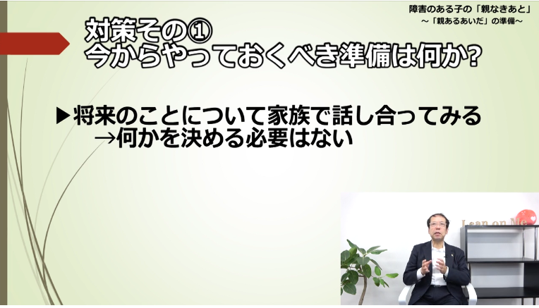 お金や法律のことは専門家に任せられますが、家族の話し合いや、本人の生活練習は、ご家族にしかできない準備です。