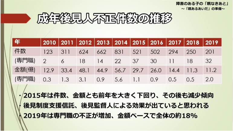こうした厳しい対策(信託や監督人)を導入した結果、不正の被害額は激減しています。